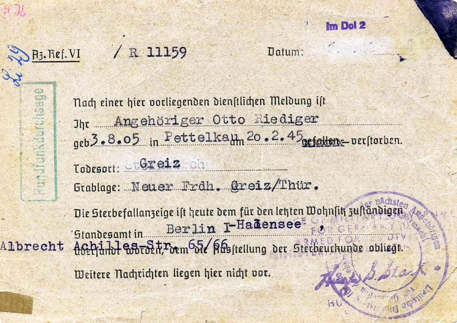 Zu diesem Zeitpunkt weiß die Familie bereits, dass Otto Riediger seine schwere Verwundung nicht überlebt hat und im Lazarett in Greiz gestorben ist. Nach der Überfahrt von Dänemark, so erinnert sich Gertrud Zillikens an diese Situation, hätte in Lübeck eine schriftliche Nachricht auf sie gewartet: „Der Papa ist tot.“ Die Wirkung der Botschaft dürfte umso verheerender gewesen sein, als Katharina Riediger – laut Tochter Gertrud vor lauter Nervosität – den Brief zunächst falsch liest und mitteilt, der Vater sei am Leben. „Ach, ich bin rausgelaufen. Ich habe mich gefreut.“ Umgehend wird Gertrud jedoch auf den Boden der Tatsachen zurückgeholt, als ihre Mutter den Irrtum erkennt. Nun heißt es unumkehrbar: „Der Papa ist tot.“ Katharina Riediger ist angesichts des Schicksalsschlages kaum in der Lage, eine Regung zu zeigen. Während Gertrud „schrecklich weint“, ist sie dazu nicht mehr in der Lage. „Wie versteinert“ habe sie im Raum gestanden und den zuvor sicherlich befürchteten, nun aber zur Gewissheit gewordenen Tod ihres Mannes nicht fassen können. „Aber es war wirklich so.“